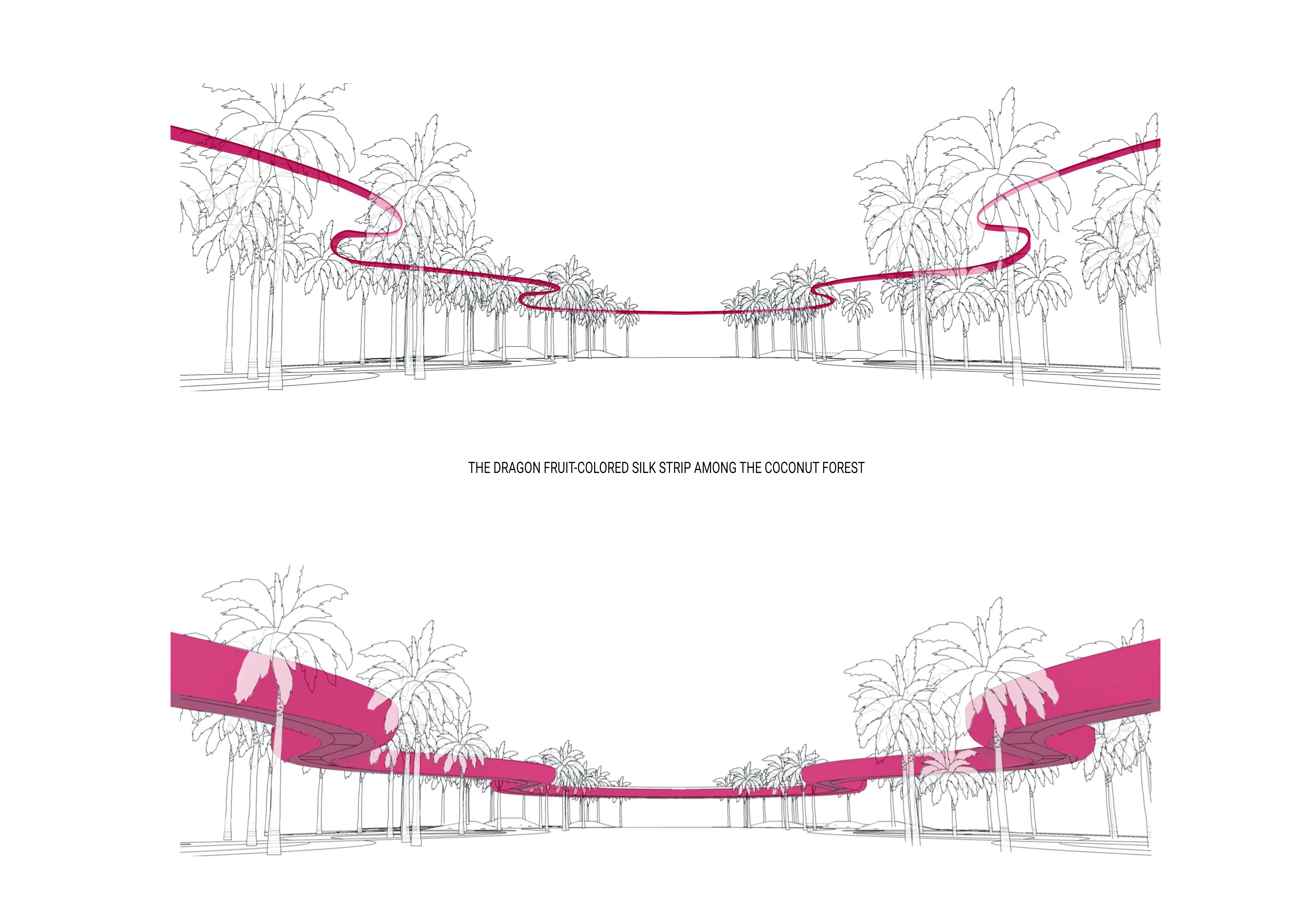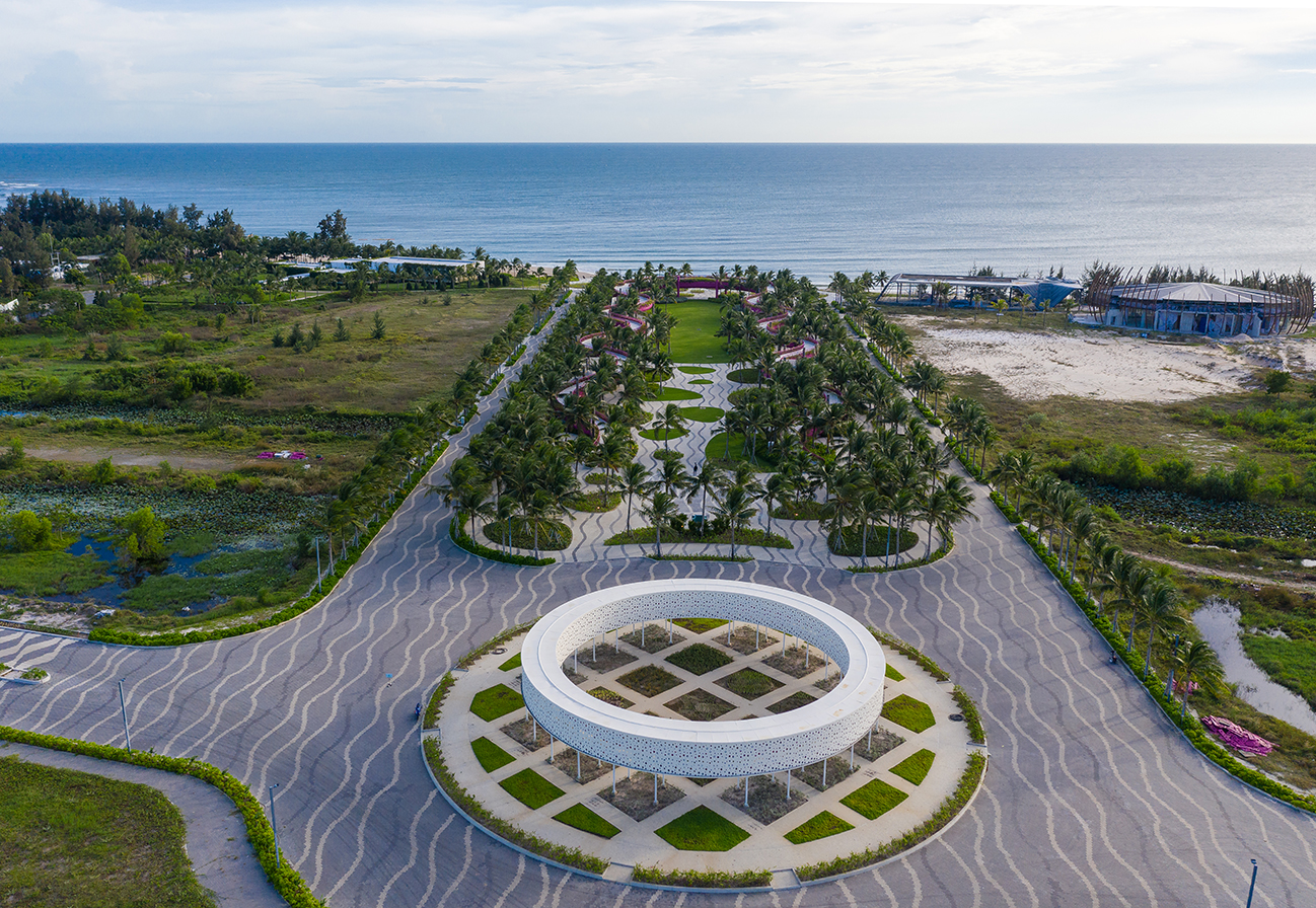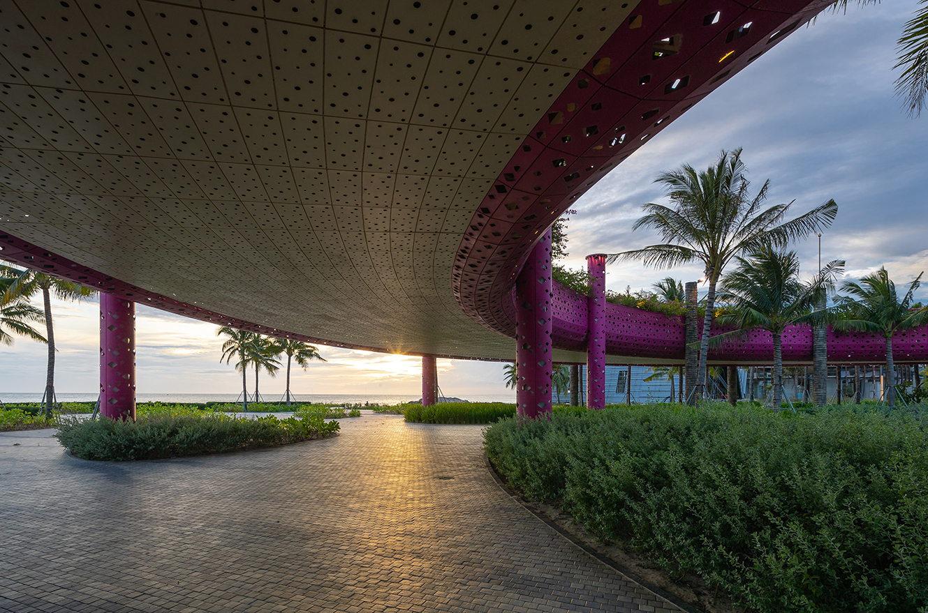Thanh Long Baywalk beach square is a design that integrates publicity with ecological orientation and solutions to create indigenous landscape highlights. The square is formed by the spatial enveloping character of the column corridor integrating dragon fruit-colored “silk strip” inside the coconut forest. The metal cladding panels are perforated to represent the fruit’s “seeds” during the day and the starry sky when night falls. The ecological paving solution with the use of precast, self-compacting concrete bricks on natural sand, on the square floor and the roads, facilitating drainage to the ground.