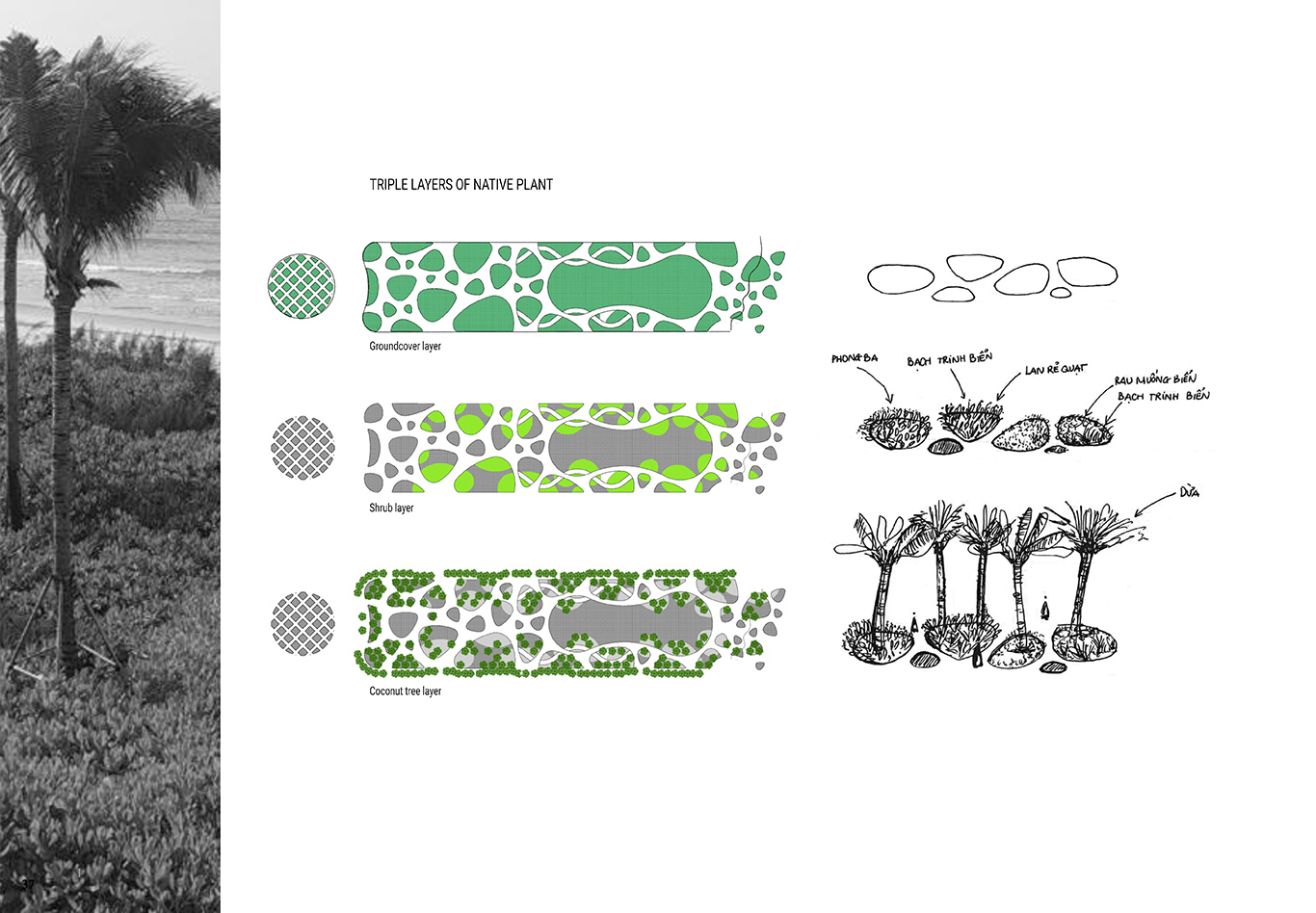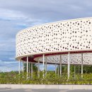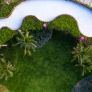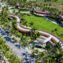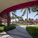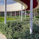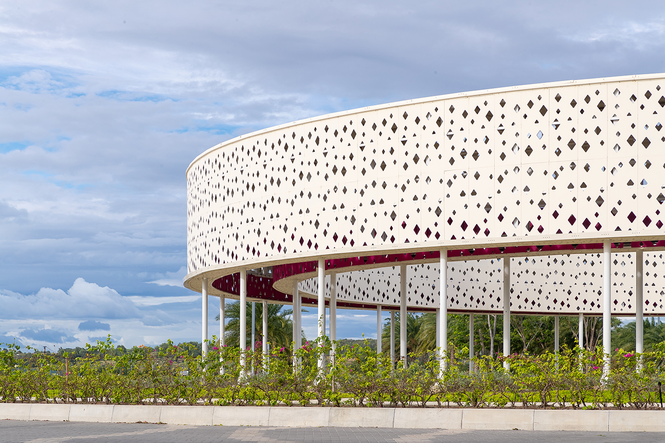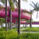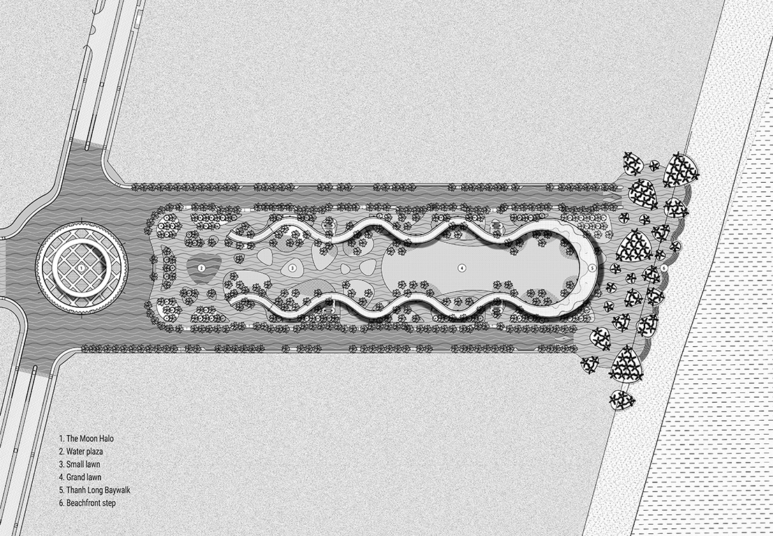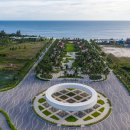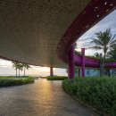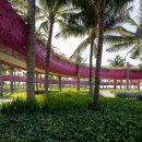 Thanh Long Baywalk beach square is a design that integrates publicity with ecological orientation and solutions to create indigenous landscape highlights. The square is formed by the spatial enveloping character of the column corridor integrating dragon fruit-colored “silk strip” inside the coconut forest. The metal cladding panels are perforated to represent the fruit’s “seeds” during the day and the starry sky when night falls. The ecological paving solution with the use of precast, self-compacting concrete bricks on natural sand, on the square floor and the roads, facilitating drainage to the ground.