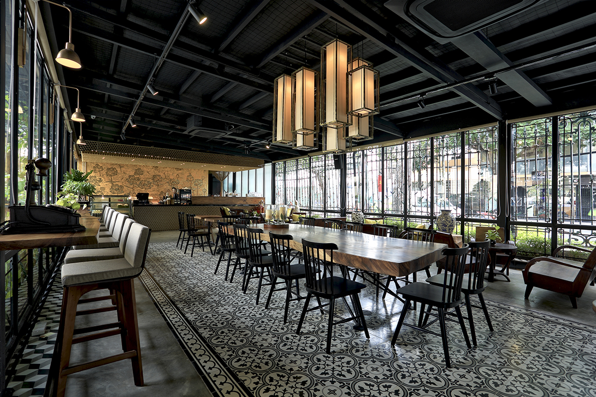 An existing space in Art Museum, the cafe is renovated with glass wall system and patterned iron frames, similar to the outside fences. Cement tiles are used for the floor to emphasize on the classsic vibes and to be suitable for the overall style of the buildings. The insides is decorated with art pieces. The whole design scheme expresses the embience of the museum as well as inherits the architectural style of the place.